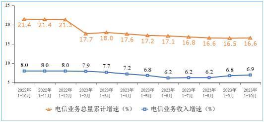 電信業(yè)務(wù)量收均實現(xiàn)小幅提升。1—10月份,電信業(yè)務(wù)收入累計完成14168億元,同比增長6.9%,增速較前三季度提升0.1個百分點。按照上年不變價計算的電信業(yè)務(wù)總量同比增長16.6%。