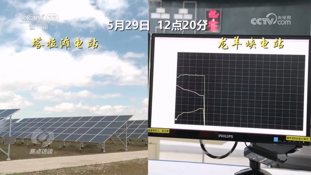 這一天,記者在龍羊峽水電站見(jiàn)到了水電光伏互補(bǔ)的實(shí)時(shí)情況。12點(diǎn)20分開(kāi)始,50公里外塔拉灘光伏現(xiàn)場(chǎng)拍攝的影像顯示,有一大片云經(jīng)過(guò)光伏電站,光伏發(fā)電輸出立即發(fā)生了變化。這個(gè)數(shù)據(jù)變化實(shí)時(shí)傳到水電站的水光互補(bǔ)系統(tǒng)。