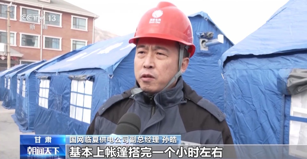 國網(wǎng)臨夏供電公司副總經(jīng)理 孫皓:基本上帳篷搭完一個(gè)小時(shí)左右,我們就能把電通上,因?yàn)槊總€(gè)點(diǎn)我們都有3到10名工作人員在跟進(jìn),充分地調(diào)動(dòng)了我們所有的人員和力量,把這項(xiàng)工作放在最重要的位置上,把老百姓的電先供好。