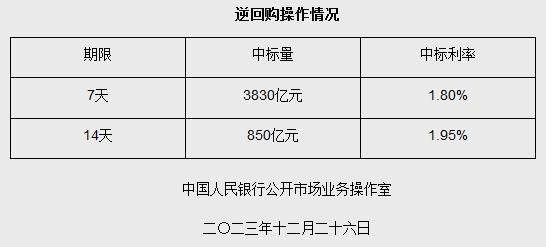 中新網(wǎng)12月26日電 據(jù)央行網(wǎng)站消息,為維護(hù)年末流動(dòng)性合理充裕,2023年12月26日人民銀行以利率招標(biāo)方式開展了4680億元7天期和14天期逆回購(gòu)操作。具體情況如下: