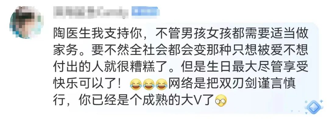 一部分網(wǎng)友認為表達了對陶勇醫(yī)生的支持:“不管男孩女孩都需要適當做家務”“玉不琢不成器”。