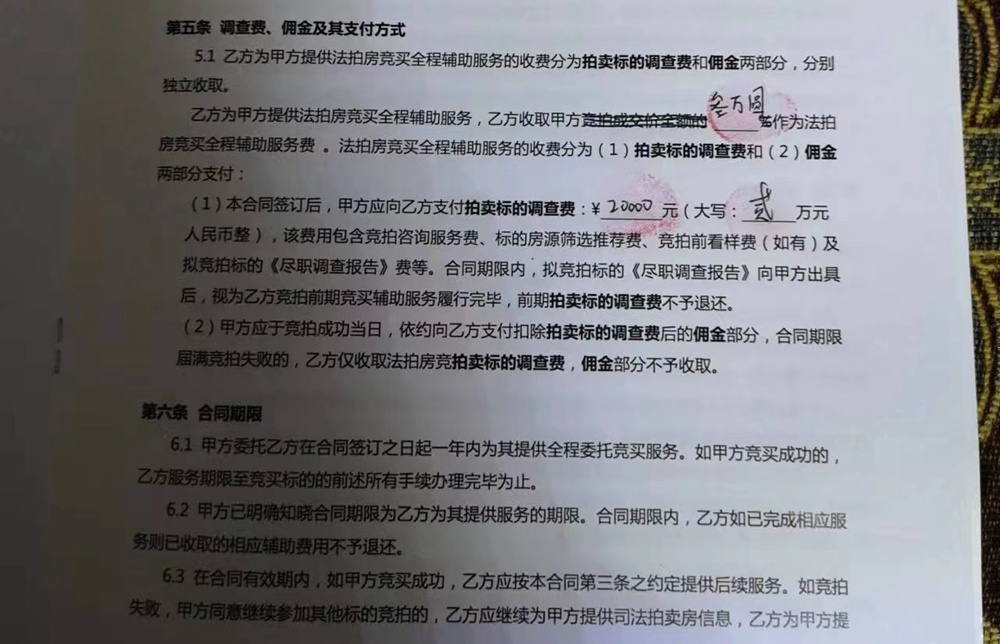 李先生說:“第一次說給錢的時候我沒同意,他又帶我去看同戶型,看了家屬說滿意,就上去叫我們交錢,承諾是包拍成功,但是合同寫的時候只寫了包過戶、包入住、包騰房,然后如果是拍成功過后,沒有成功入住,以房價的1.2倍回購,后面寫了個‘調查服務費’,就先交錢,交錢之后再給我們簽合同,說你只要這次來簽了合同,第二次就來拍成功了,你交傭金1萬塊,第三次就是你過來拿房產證、鑰匙,其他不用你操任何心?!?/p>