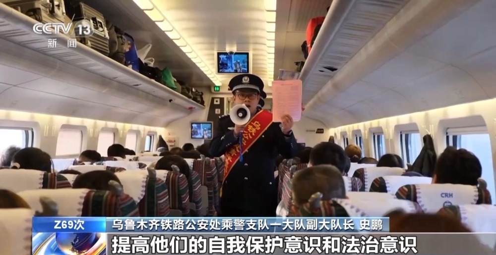 烏魯木齊鐵路公安處乘警支隊(duì)一大隊(duì)副大隊(duì)長(zhǎng) 史鵬:希望通過(guò)這種方式,能夠讓乘坐我們列車(chē)的旅客提高他們的自我保護(hù)意識(shí)和法治意識(shí),確保旅客們平安出行。