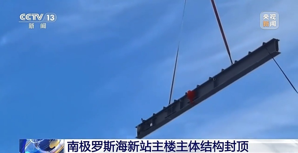 總臺央視記者 李寧:這里就是南極羅斯海新站的建設(shè)現(xiàn)場,現(xiàn)在正在進行吊裝作業(yè)的就是新站主樓的最后一根鋼梁。為了慶祝這個重要的工程節(jié)點,隊員們給這根鋼梁戴上了大紅花。隨著這根鋼梁的成功吊裝,標志著羅斯海新站的主樓主結(jié)構(gòu)完成了封頂。