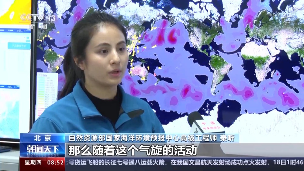 自然資源部國家海洋環(huán)境預(yù)報(bào)中心高級(jí)工程師 秦聽:那么隨著這個(gè)氣旋的活動(dòng),就會(huì)造成這種南半球的中低緯度的暖濕氣流,與南極的冷氣團(tuán)之間的碰撞,所形成的這種極地的降雪,以及海霧這種低能見度的一個(gè)情況,并且會(huì)引起它作業(yè)海區(qū)的一個(gè)大風(fēng)、海浪的這種高海況天氣。