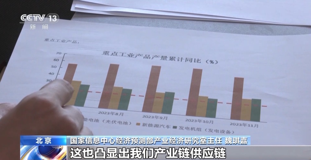 國家信息中心經(jīng)濟(jì)預(yù)測部產(chǎn)業(yè)經(jīng)濟(jì)研究室主任 魏琪嘉:像這樣的產(chǎn)品實(shí)現(xiàn)了兩位數(shù)的增長的這種態(tài)勢(shì),其實(shí)對(duì)于一個(gè)經(jīng)濟(jì)體來講是實(shí)屬不易的。這也凸顯出我們產(chǎn)業(yè)鏈供應(yīng)鏈配套能力的大幅提升。產(chǎn)品背后蘊(yùn)含的是技術(shù)、要素的優(yōu)化組合,催生出新的生產(chǎn)能力,其實(shí)也是我們經(jīng)濟(jì)發(fā)展中的這種亮點(diǎn)。