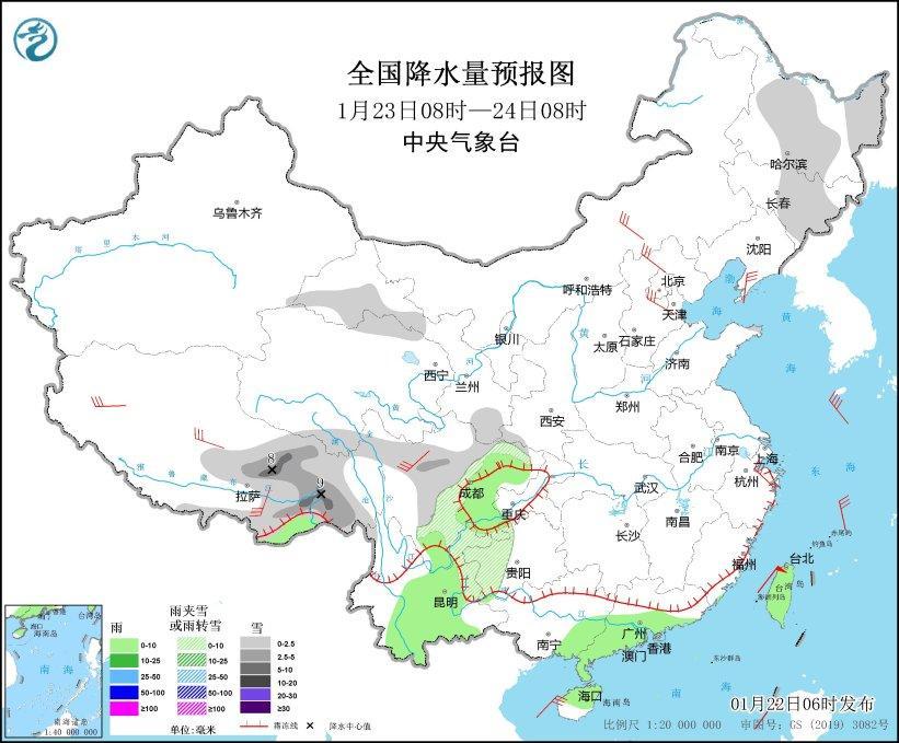 1月23日08時(shí)至24日08時(shí),黑龍江中東部、吉林中東部、西藏南部和東部、青海北部和南部、甘肅河西和南部、川西高原中東部、四川盆地西部、貴州西部、云南東北部等地部分地區(qū)有小雪或雨夾雪,其中,西藏東部局地有中到大雪(5~9毫米)。西藏東南部、四川盆地西部、云南中東部、廣西東部、廣東中南部、海南島中北部、臺(tái)灣島等地部分地區(qū)有小雨。內(nèi)蒙古中部、遼東半島、河北中北部、浙江北部、川西高原北部等地部分地區(qū)有5~6級(jí)風(fēng),渤海、渤海海峽、黃海、東海、臺(tái)灣海峽、臺(tái)灣以東洋面、巴士海峽、南海大部、北部灣等海域有6~7級(jí)風(fēng),陣風(fēng)8~9級(jí)(見圖4)。