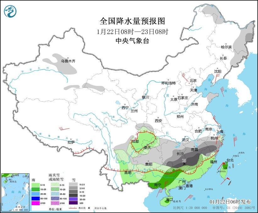 1月22日08時(shí)至23日08時(shí),黑龍江東部和西北部、吉林東部、新疆中部、甘肅河西、川西高原西南部、四川盆地南部、陜西南部、重慶東部、云南東部、貴州、湖北西部、湖南南部、江西、安徽南部、浙江中南部、福建北部、廣東北部、廣西北部等地部分地區(qū)有小到中雪或雨夾雪,其中,湖南南部、江西中南部、浙江西南部、福建西北部、廣西東北部、廣東北部等地部分地區(qū)有大到暴雪(10~15毫米)。四川盆地中部、云南中部、廣西中南部、廣東中南部、福建中南部、海南島、臺(tái)灣島等地部分地區(qū)有小到中雨。遼東半島、河北北部、浙江北部、廣西東南部沿海等地部分地區(qū)有5~6級(jí)風(fēng),渤海、渤海海峽、黃海、東海、臺(tái)灣海峽、臺(tái)灣以東洋面、巴士海峽、南海大部、北部灣等海域有6~8級(jí)風(fēng),陣風(fēng)9~10級(jí)(見圖3)。