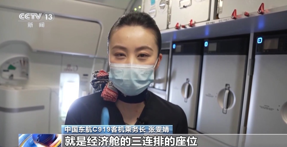 中國東航C919客機乘務長 張雯婧:我們非常特別的一點就是經(jīng)濟艙的三連排的座位,它要比其他的飛機中間座位更寬一點,寬1.5厘米。