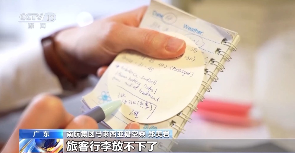 南航集團馬來西亞籍空乘 鄭美君:有一位旅客坐在36排K,行李后面放不下了,我就給他移到前面,我又擔心自己會忘記,所以我一放下就直接把它記下來。