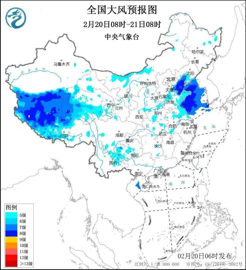 預(yù)計,2月20日8時至21日8時,西藏中西部、青海中南部、內(nèi)蒙古中西部、遼寧南部、華北東南部、黃淮西部和東部、江淮西部和北部等地的部分地區(qū)有5至7級風(fēng),陣風(fēng)8至9級。渤海、渤海海峽、黃海大部海域?qū)⒂?至8級,陣風(fēng)9至10級的大風(fēng)。