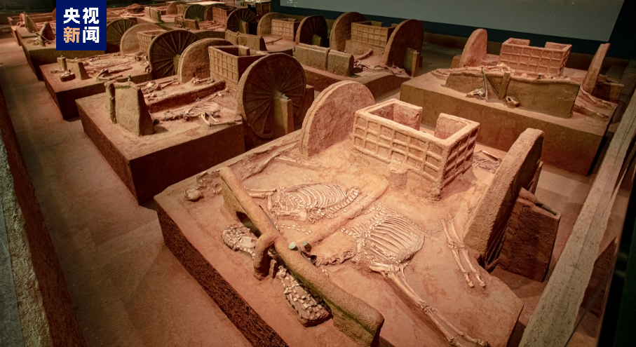“車轔轔馬蕭蕭”殷墟車馬遺跡展,展廳內(nèi)23座車馬坑遺跡,矩陣式陳列,氣勢(shì)震撼。展示了商代裝飾華麗、結(jié)構(gòu)精巧、機(jī)動(dòng)靈活的馬車,是中國(guó)目前所見最早的馬車實(shí)物標(biāo)本,更是對(duì)三千多年前商文明的生動(dòng)詮釋。經(jīng)過近百年探索,殷墟發(fā)掘車馬坑九十余座,再現(xiàn)了商代馬車面貌。馬車不僅作為王室貴族的代步工具,也在驛站傳遞、田獵出行、載兵作戰(zhàn)等方面發(fā)揮著重要作用。殷墟馬車多埋于大型墓葬附近或墓道內(nèi)、以車、馬、人合葬居多。殷墟早期以車馬器陪葬,車馬器套數(shù)代表主人所擁有的馬車數(shù)量,見證著主人身份等級(jí)的高低;晚期馬車陪葬成為中、上級(jí)貴族的專屬,彰顯著墓主人的赫赫權(quán)威,亦是馬車陪葬制度的萌芽。
