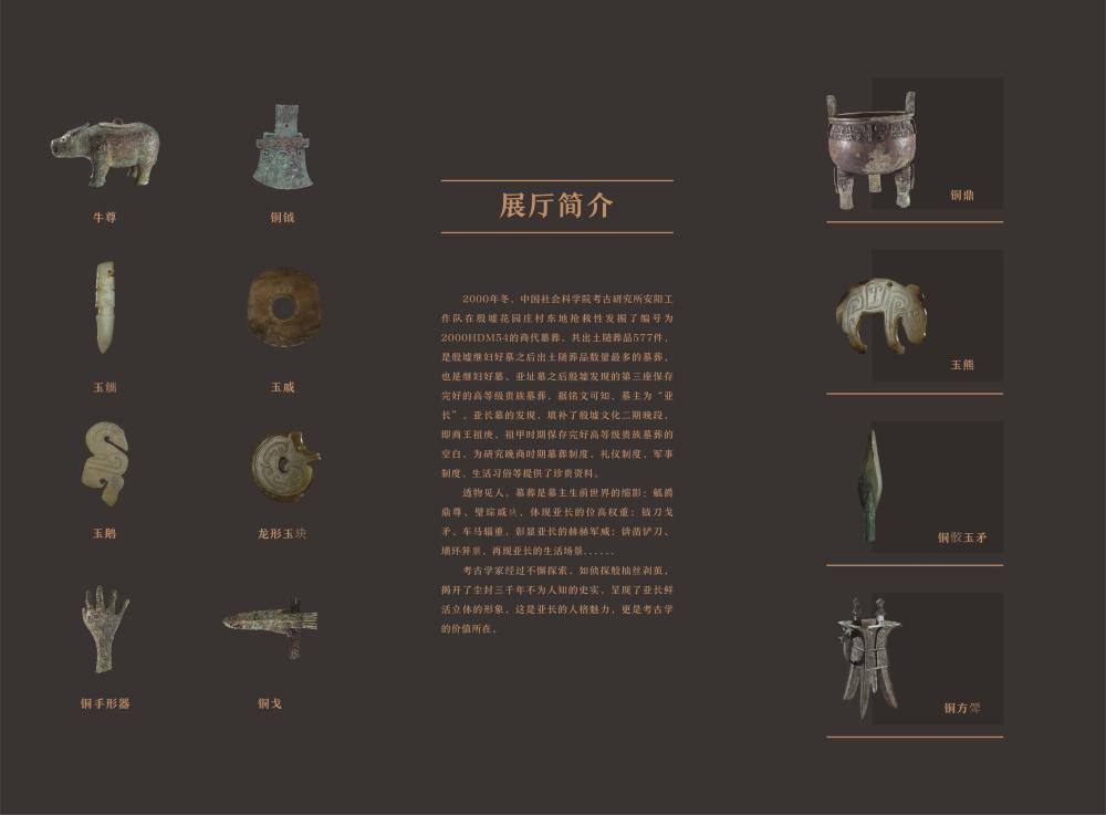 “長(zhǎng)從何來-殷墟花園莊東地亞長(zhǎng)墓專題展廳”以“亞長(zhǎng)”這位殷商時(shí)期的大將軍為主人公,通過亞長(zhǎng)墓出土的577件文物,生動(dòng)展現(xiàn)了他的赫赫戰(zhàn)功、排兵布陣、生活起居等場(chǎng)景。亞長(zhǎng)墓是殷墟繼婦好墓之后出土隨葬品數(shù)量最多的墓葬。據(jù)銘文可知,墓主為“亞長(zhǎng)”。透物見人,墓葬是墓主生前世界的縮影:觚爵鼎尊、璧琮戚玦,體現(xiàn)亞長(zhǎng)的位高權(quán)重;鉞刀戈矛、車馬輜重,彰顯亞長(zhǎng)的赫赫軍威;錛鑿鏟刀、璜環(huán)笄觿,再現(xiàn)亞長(zhǎng)的生活場(chǎng)景。考古學(xué)家經(jīng)過不懈探索,如偵探般抽絲剝繭,揭開了塵封三千年不為人知的史實(shí),呈現(xiàn)了亞長(zhǎng)鮮活立體的形象,這是亞長(zhǎng)的人格魅力,更是考古學(xué)的價(jià)值所在。
