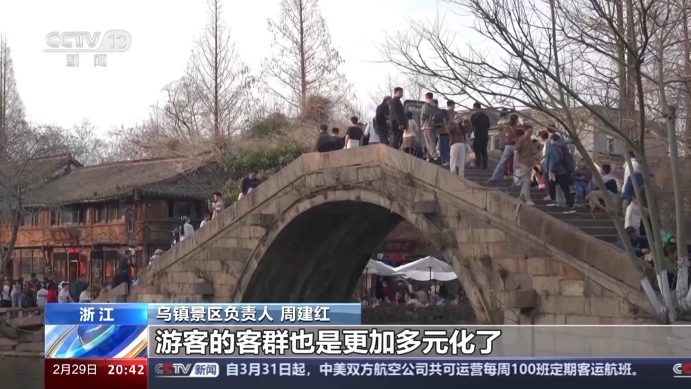 烏鎮(zhèn)景區(qū)負(fù)責(zé)人 周建紅:二月份來看,我們整個(gè)線上營(yíng)銷比例已經(jīng)超過了線下,占比達(dá)到了60%,旅游產(chǎn)品也是在做不斷的一個(gè)迭代,游客的客群也是更加多元化了。十年前的春節(jié),游客量在20多萬,那這一次的春節(jié)的話,我們已經(jīng)是突破了50萬人次,也是翻倍的一個(gè)增長(zhǎng)。
