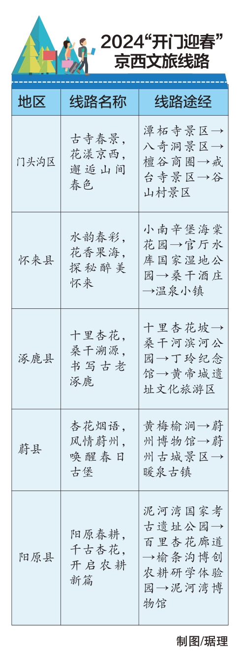 門頭溝區(qū)聯(lián)動河北省張家口市懷來縣、涿鹿縣、蔚縣、陽原縣共同發(fā)布“詩畫京西春暉行”五條春游線路,圍繞踏青、賞花、徒步、騎行、露營、微度假等元素展開,為促進(jìn)京津冀消費(fèi)和北京一季度“開門紅”提供助力。