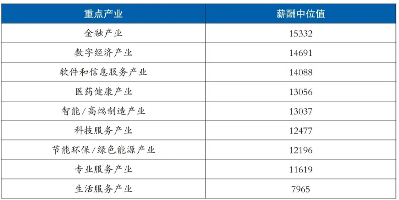 2024年第一季度,重點產(chǎn)業(yè)中金融、數(shù)字經(jīng)濟、軟件和信息服務(wù)業(yè)薪酬中位值位居前三,分別為 15332 元、14691 元、14088 元,生活服務(wù)產(chǎn)業(yè)薪酬中位值為7965元,漲幅較為突出。