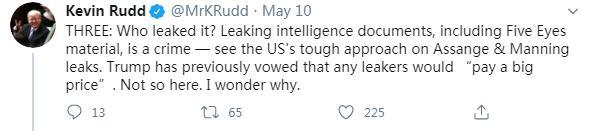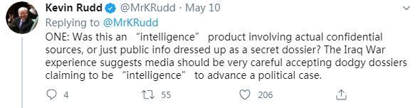 5月10日,陸克文在社交媒體再次連發(fā)五問(wèn),質(zhì)疑可能參與此次“甩鍋中國(guó)”事件的各方。他的第一問(wèn)稱,這所謂的15頁(yè)“情報(bào)”,究竟是源于真實(shí)的絕密情報(bào),還是根據(jù)公開(kāi)信息拼湊而成?他表示,“伊拉克戰(zhàn)爭(zhēng)的教訓(xùn)早已告誡媒體,必須謹(jǐn)慎對(duì)待所謂的‘情報(bào)’,以防陷入某種政治目的之中。”