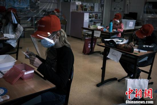 當?shù)貢r間5月12日,法國中部圣埃蒂安附近的拉格蘭德克羅伊市,當?shù)匦W(xué)生戴著統(tǒng)一發(fā)放的面罩上課。據(jù)報道,當?shù)貢r間5月11日,法國開始逐步“解封”,結(jié)束已經(jīng)持續(xù)55天的全國“封城”狀態(tài)。