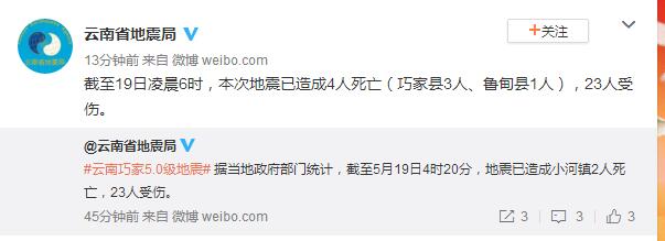 中新網(wǎng)5月19日電 據(jù)云南省地震局官方微博消息,截至19日凌晨6時,云南巧家5.0級地震已造成4人死亡(巧家縣3人、魯?shù)榭h1人),23人受傷。