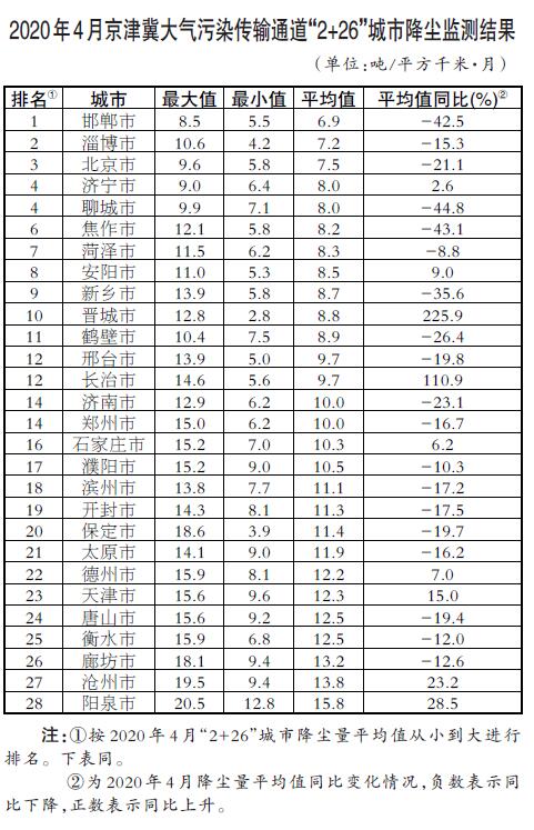 生態(tài)環(huán)境部今日向媒體公布了2020年4月京津冀大氣污染傳輸通道“2+26”城市(以下簡(jiǎn)稱“2+26”城市)和汾渭平原11城市降塵監(jiān)測(cè)結(jié)果。
