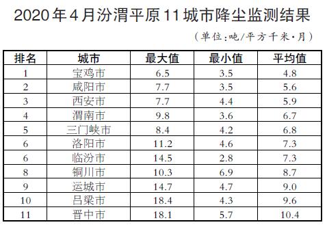 4月,汾渭平原11城市降塵量均值范圍在4.8-10.4噸/平方千米·月之間,平均為7.4噸/平方千米·月。寶雞、咸陽、西安、渭南、三門峽、洛陽、臨汾、銅川和運(yùn)城市等9個(gè)城市降塵量平均值小于或等于9.0噸/平方千米·月;呂梁和晉中市2個(gè)城市降塵量平均值大于9.0噸/平方千米·月,其中晉中市降塵量平均值最大,達(dá)10.4噸/平方千米·月。渭南、銅川、洛陽、臨汾、運(yùn)城、晉中和呂梁市等7個(gè)城市降塵量最大值大于9.0噸/平方千米·月。