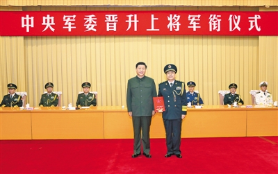 下午4時30分許,晉銜儀式在莊嚴的國歌聲中開始。中央軍委副主席許其亮宣讀了中央軍委主席習近平簽署的晉升上將軍銜命令。中央軍委副主席張又俠主持晉銜儀式。