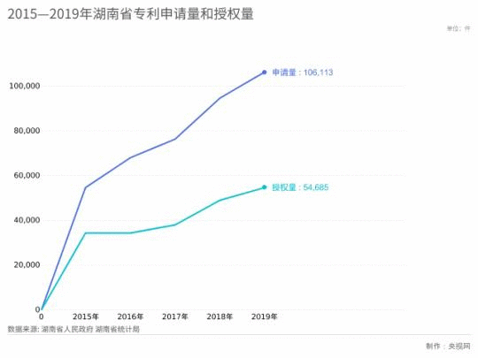 圖6:2015—2019年湖南省專(zhuān)利申請(qǐng)量和授權(quán)量