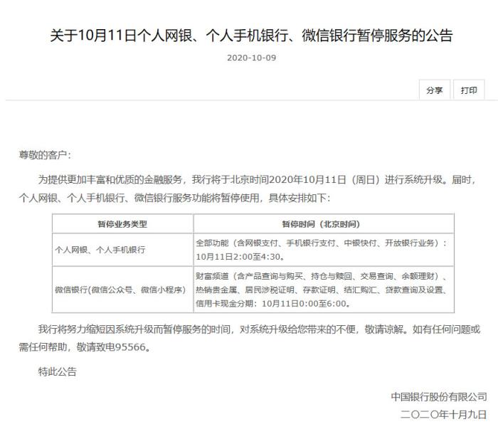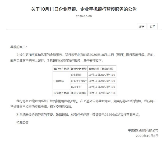 中新網(wǎng)客戶端10月10日電(彭婧如)近日,中國銀行先后發(fā)布《關(guān)于10月11日企業(yè)網(wǎng)銀、企業(yè)手機銀行暫停服務(wù)的公告》、《關(guān)于10月11日個人網(wǎng)銀、個人手機銀行、微信銀行暫停服務(wù)的公告》。根據(jù)公告,中國銀行將于北京時間2020年10月11日(周日)進行系統(tǒng)升級。屆時,面向企業(yè)客戶的網(wǎng)上銀行、手機銀行業(yè)務(wù)將暫停服務(wù),個人網(wǎng)銀、個人手機銀行、微信銀行服務(wù)功能也將暫停使用。