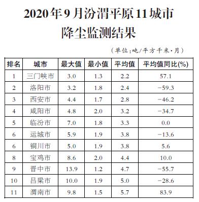 9月,汾渭平原11個(gè)城市降塵量均值范圍在2.2-5.7噸/平方千米·月之間,平均為3.8噸/平方千米·月,同比下降22.4%。汾渭平原11個(gè)城市降塵量平均值均小于9.0噸/平方千米·月。渭南、呂梁、晉中等3個(gè)城市降塵量最大值高于9.0噸/平方千米·月。三門峽、銅川、寶雞、渭南等4個(gè)城市降塵量平均值同比不降反升。