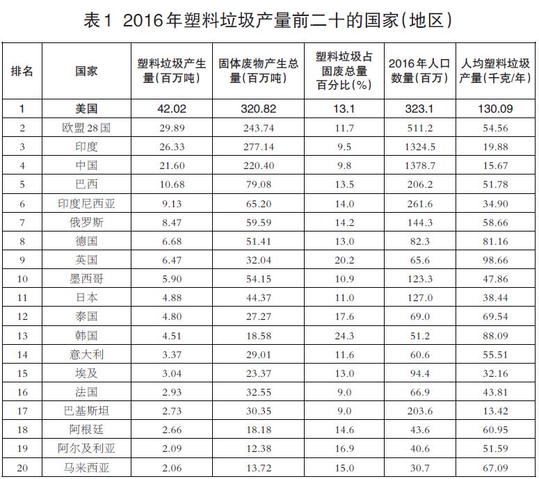 對(duì)比兩次研究結(jié)果發(fā)現(xiàn),從2010年到2016年,全球塑料生產(chǎn)量從3.34億噸增加到了4.22億噸,增加了26%,全球塑料垃圾占固體廢物的比例從10%上漲到了12%,2016年全球塑料垃圾達(dá)到了2.42億噸。從2016年每個(gè)國(guó)家產(chǎn)生的垃圾量(表1)看出,美國(guó)產(chǎn)生的固體廢物總量、塑料垃圾總量以及人均塑料垃圾產(chǎn)量(超過(guò)100千克)均為世界最多。相比之下,中國(guó)的人均塑料垃圾生產(chǎn)量?jī)H為美國(guó)的20%。歐盟28國(guó)作為一個(gè)整體,雖然總?cè)丝谥挥杏《然蛑袊?guó)人口的40%,產(chǎn)生的塑料垃圾總量比印度或中國(guó)都要多。但即便在歐盟,人均塑料垃圾產(chǎn)量也不到美國(guó)的一半。