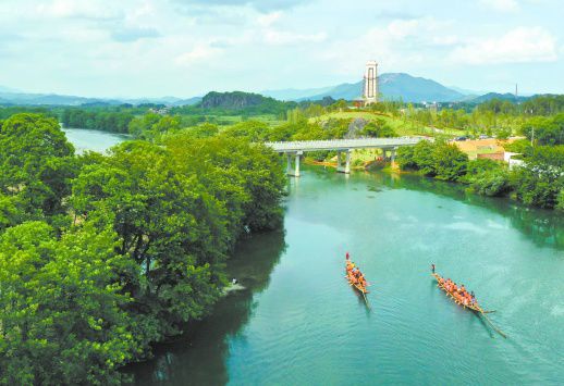 5月26日,道縣洑水河梅花貴頭段,村民在河面上劃龍舟。近年,道縣堅(jiān)持以生態(tài)立縣,實(shí)施退耕還林、封山育林、水土保持、礦山植被修復(fù)等生態(tài)工程,不斷擴(kuò)大森林面積,提高水源涵養(yǎng)能力,全縣生態(tài)持續(xù)向好,呈現(xiàn)出“河清、岸綠、景美”的生態(tài)景觀。(蔣克青 雷伙生 攝影報(bào)道)