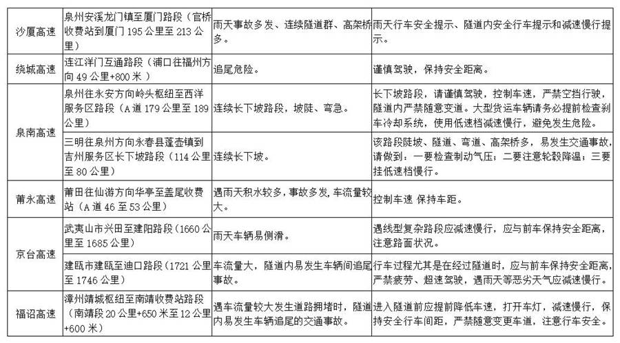 廈蓉高速海滄樞紐至玉蘭樞紐路段,包含天成山隧道、陳巷樞紐等,福詔高速薌城天寶至平和小溪路段,包含靖城樞紐、公山尾隧道、高梨山隧道等,為事故多發(fā)易發(fā)路段。交警提示:在樞紐路段應(yīng)注意辨識道路指示牌,切勿突然減速或停車查看。