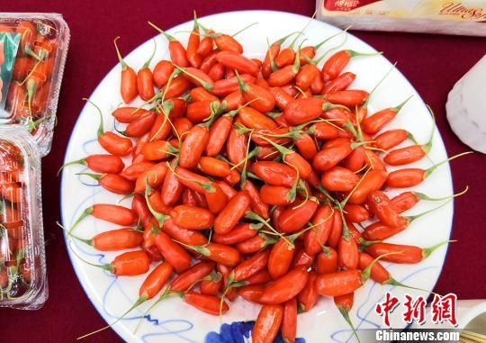 6月28日,甘肅省靖遠縣2019年文化旅游農(nóng)特產(chǎn)品天津?qū)鐾平闀谔旖蚺e行。圖為枸杞鮮果展示。 劉玉桃 攝