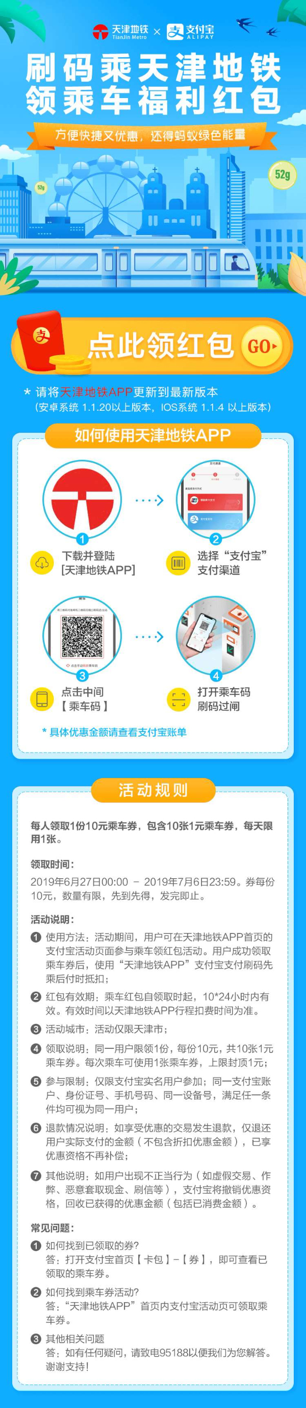 1.乘客可在6月27日至7月6日期間,打開(kāi)“天津地鐵APP”首頁(yè)的支付寶活動(dòng)頁(yè)面跳轉(zhuǎn)至支付寶APP,領(lǐng)取一份支付寶紅包,每份紅包內(nèi)含10張1元乘車(chē)券,共10元優(yōu)惠金額。