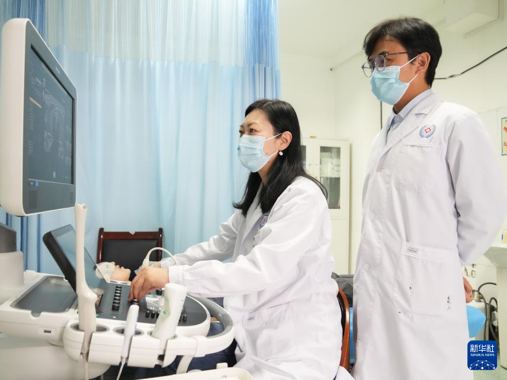 在西藏自治區(qū)人民醫(yī)院,徐鐘慧(左)與徒弟宋彬彬在為患者進行超聲檢查(7月12日攝)。新華社發(fā)