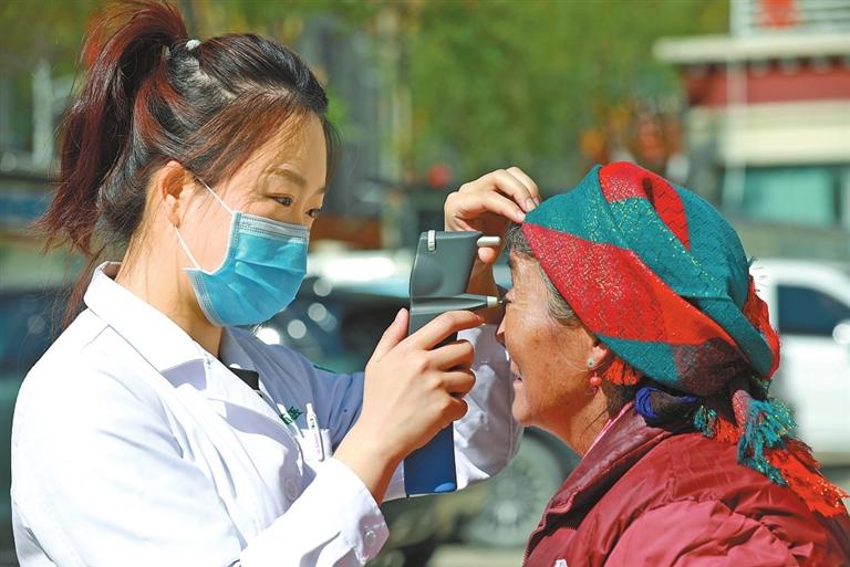 援藏工作隊(duì)“雪域光明行”活動(dòng)中,黑龍江援藏醫(yī)生為群眾檢查眼睛。