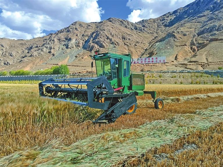 北大荒集團(tuán)青稞標(biāo)準(zhǔn)化種植示范區(qū)內(nèi)聯(lián)合收割機(jī)正在作業(yè)。