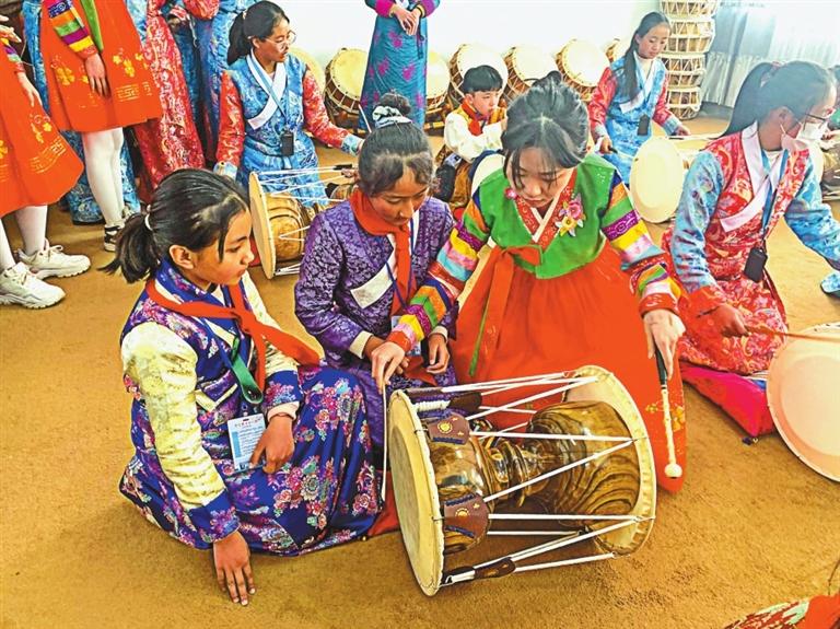 在“吉藏一家親”冬令營(yíng)活動(dòng)中,日喀則學(xué)生在朝鮮族學(xué)生指導(dǎo)下學(xué)習(xí)打朝鮮族長(zhǎng)鼓。