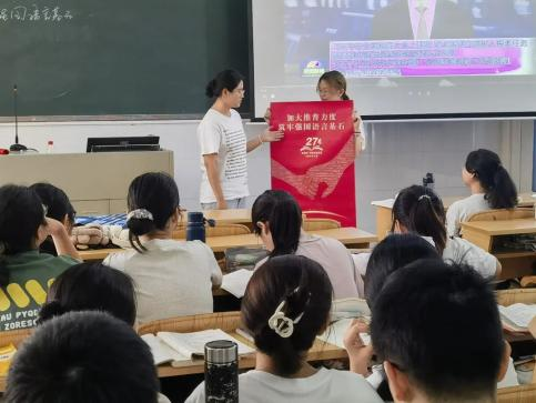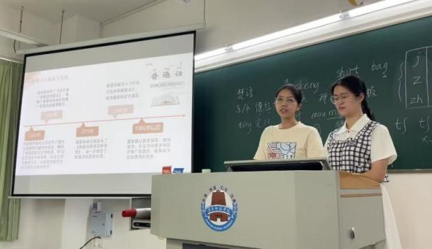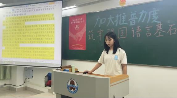 新學(xué)期伊始,《教師語言》課程教學(xué)團隊將推普宣傳與課程的“音韻筑基”內(nèi)容相結(jié)合,理論層面講解我國通用語言文字的相關(guān)法律政策和普通話聲、韻、調(diào)等基礎(chǔ)知識;實踐層面指導(dǎo)學(xué)生利用中國語言文字數(shù)字博物館、師圈小程序等課程資源進行學(xué)習(xí),邀請學(xué)生介紹普通話的發(fā)展歷程和我國第27屆推普宣傳主題中所滲透的“強國必須強語,強語助力強國”價值內(nèi)涵。