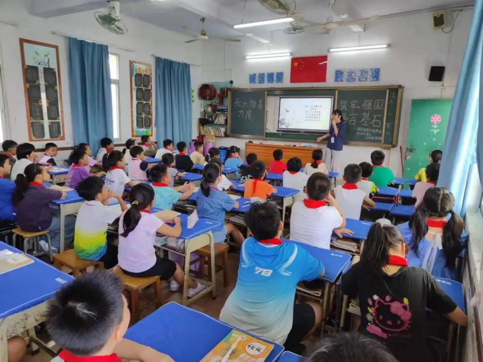 21級實習(xí)生戴鈺瑩在湛江市第四小學(xué)舉辦推普活動,將紅色經(jīng)典與傳統(tǒng)文化教育相結(jié)合,通過誦讀《西江月·井岡山》和《三字經(jīng)》,讓學(xué)生感受到革命先烈的英勇無畏,傳承了中華民族的傳統(tǒng)美德與智慧,增強了文化自信與民族自豪感。