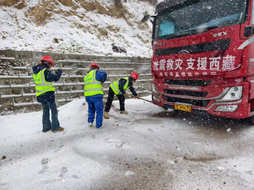 1月13日中午,一輛滿載援藏物資的紅色卡車在海拔4800米的安多境內(nèi)遭遇強降雪,車輛失控,形勢萬分危急。在這關(guān)鍵時刻,中交建設(shè)者們挺身而出,成功救助了遇險車輛,確保了寶貴物資的安全。