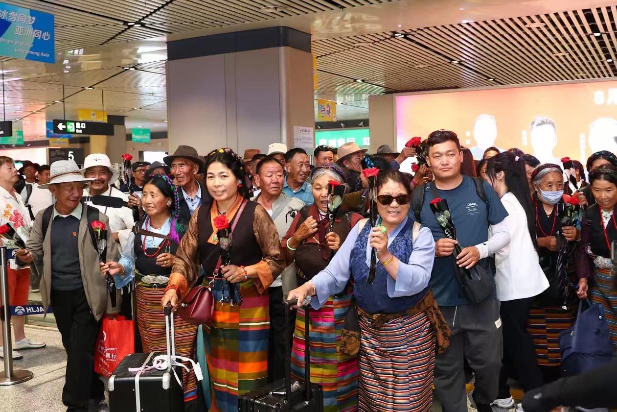 西藏游客搭乘“龍藏號”旅游包機順利抵達哈爾濱