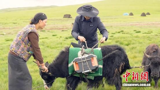 浙江援藏人員給牧民放牧的牦牛綁上“移動式光儲一體微電站”設備。毛一豐 供圖