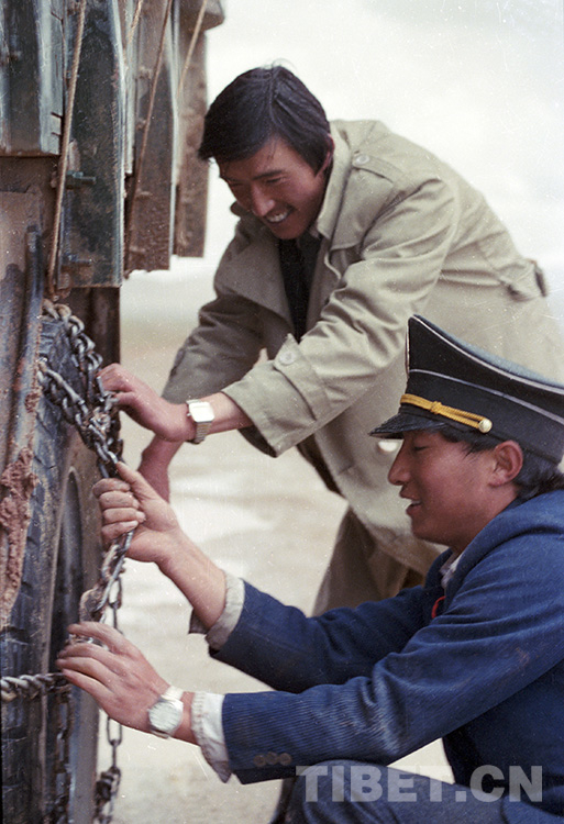 這是郵政人員正在為郵車的輪胎綁防滑鏈條,以便郵車順利通過泥濘路。上世紀七八十年代,由于藏北西部交通不便,每半月通郵一次的郵車常常會在草原上遭遇陷車等困難(唐召明1987年攝)