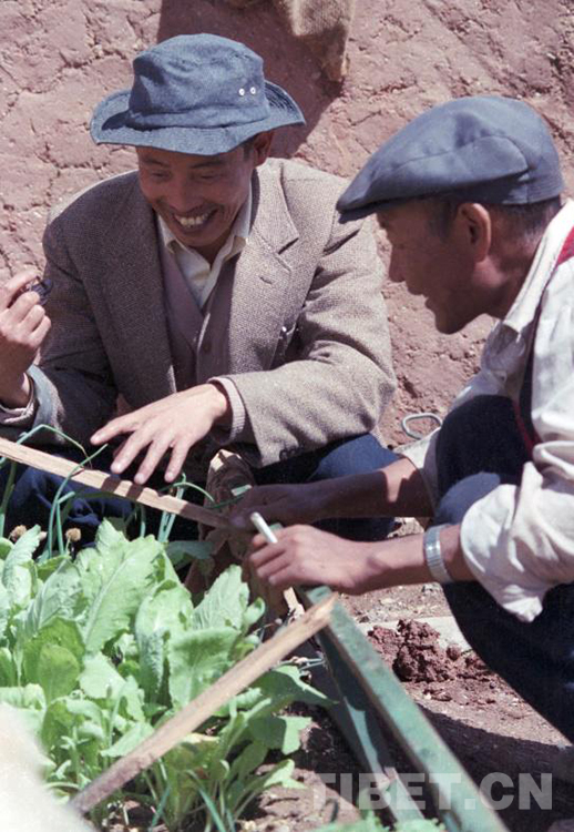 這是時任雙湖辦事處(現(xiàn)雙湖縣)紀律檢查委員會書記的熊亮兵(左),正在觀察自己在家門口通過搭塑料薄膜小篷試種的蔬菜(唐召明1987年攝)
