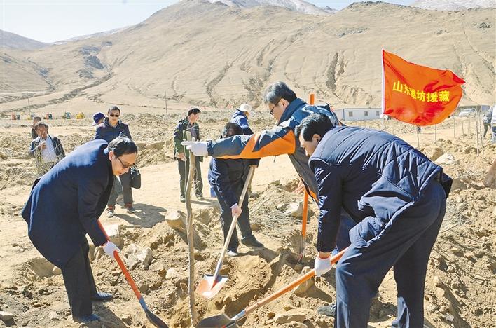2012年,由山東省濰坊市第六批援藏工作隊具體負(fù)責(zé)的“湘河谷”經(jīng)濟林生態(tài)產(chǎn)業(yè)扶貧項目在南木林縣實施。項目集旅游觀光、苗木生產(chǎn)、林產(chǎn)品深加工、果品銷售于一體,總投資20億元,規(guī)劃面積10萬畝。最終形成地方政府、當(dāng)?shù)厝罕姟⑵髽I(yè)共同受益的“全贏”局面。 圖為山東省濰坊市援藏干部正在栽植經(jīng)濟林木(2012年3月12日攝)。 (本版圖片均為資料圖片)