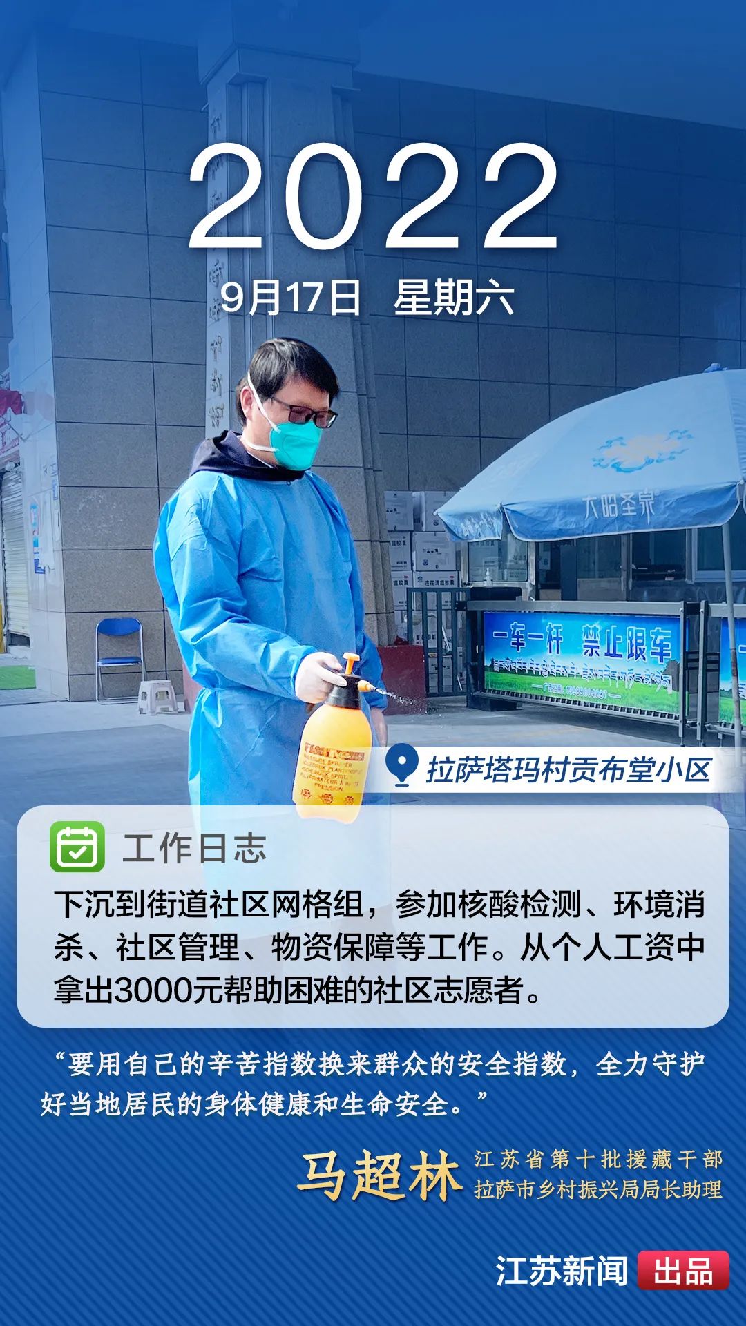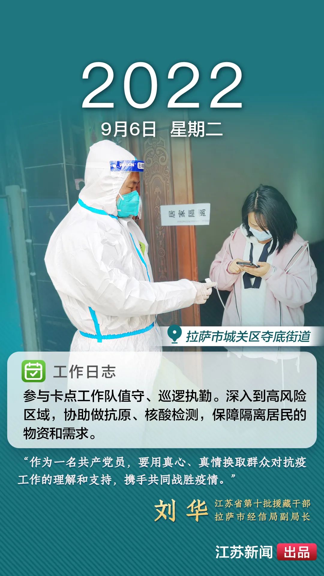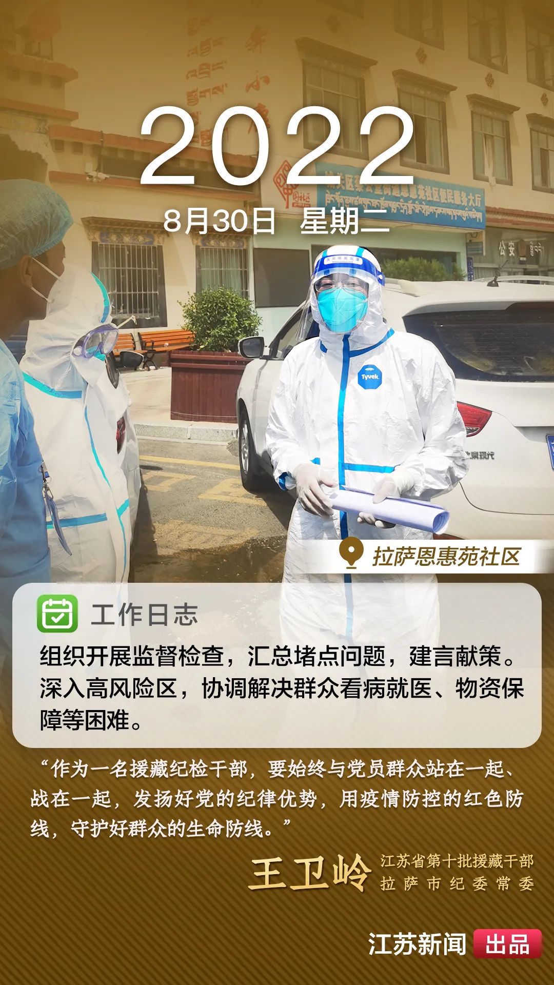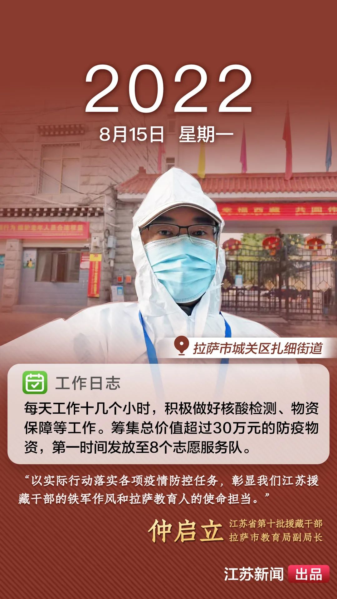 2022年8月,一場(chǎng)突如其來(lái)的新冠肺炎疫情襲擊拉薩。江蘇援藏前方指揮部樹(shù)立高度的政治意識(shí),堅(jiān)決貫徹江蘇省委、省政府主要領(lǐng)導(dǎo)批示精神和自治區(qū)、拉薩市部署要求,全力以赴做好疫情防控工作。第十批援藏干部人才克服初到高原的身體反應(yīng),服從服務(wù)大局、勇于擔(dān)當(dāng)作為,迅速投身疫情防控工作一線,以實(shí)際行動(dòng)展現(xiàn)江蘇援藏的鐵軍作風(fēng)。近期,我們將陸續(xù)推出江蘇援藏干部人才抗疫身影,敬請(qǐng)關(guān)注。