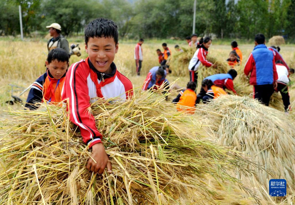日喀則市上海實驗學校的學生們在青稞地里勞動(9月17日攝)。新華社發(fā)(潘杰 攝)