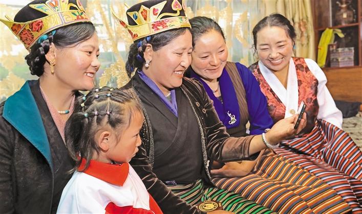 墨竹工卡縣群眾通過(guò)手機(jī)收看慶祝大會(huì)。記者 洛桑 次旺 唐斌 潘多 攝