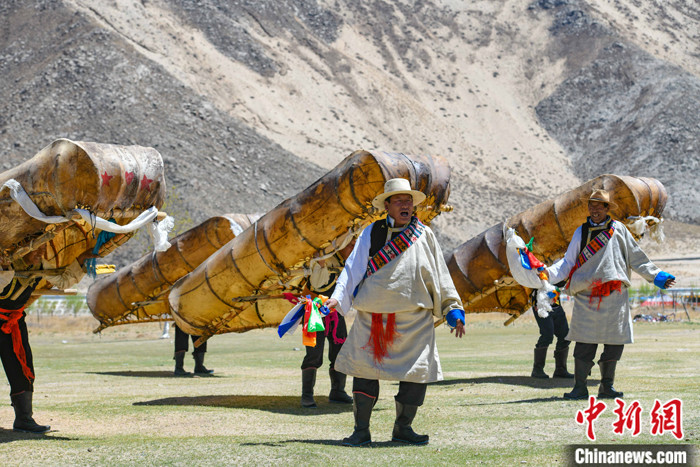 資料圖為西藏拉薩曲水縣俊巴漁村村民穿著盛裝表演牛皮船舞。 中新社記者 貢嘎來松 攝